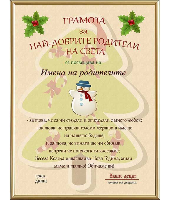 Подарък, който ще краси стената дълго време и ще предизвиква усмивки у Вашите родители. Грамота за мама и татко за Коледа. Изберете желания размер на рамката. Един сантиментален и много отличителен подарък за Коледа. Наградете Вашите родители, защото те го заслужават.