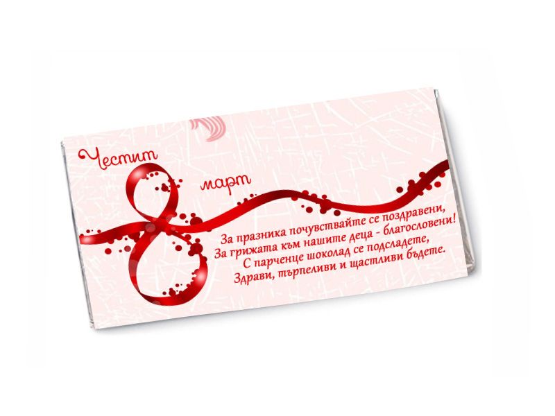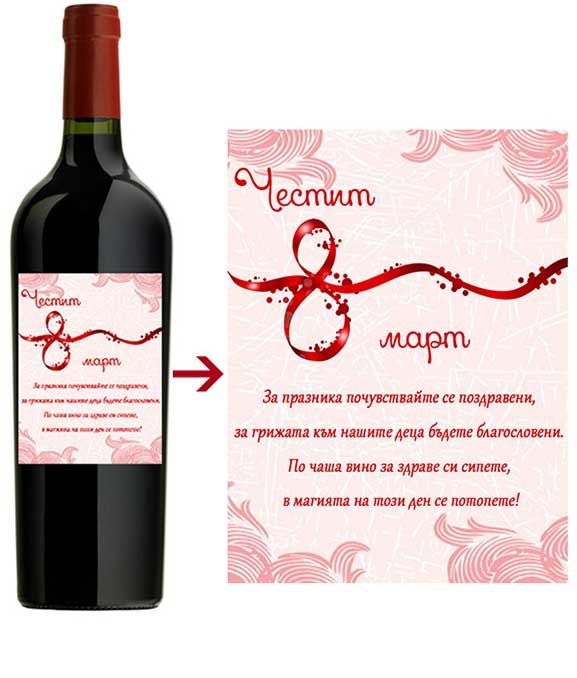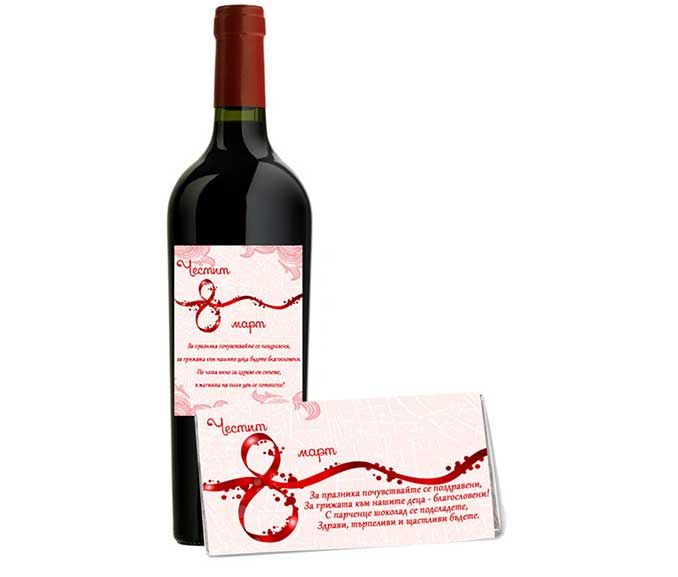 Подбрали сме една много подходяща комбинация за подарък за осми март - бутилка червено или бяло вино и шоколад с персонални етикети. Изберете текст за шоколада и виното и ние ще го поставим на етикетите. Специално за най-страхотните жени.